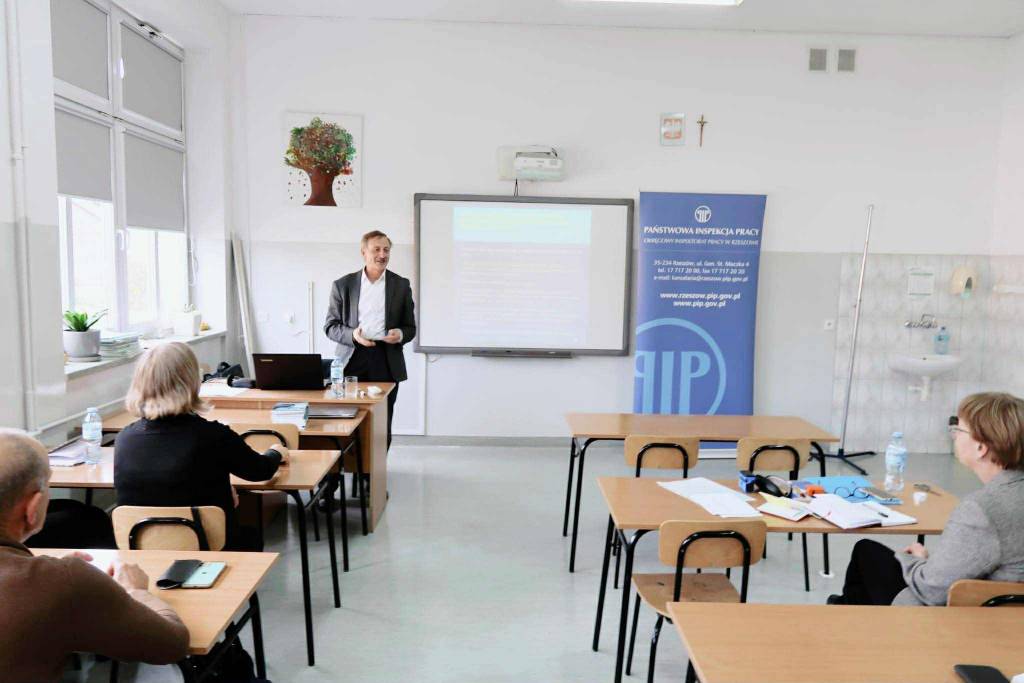 Podczas szkolenia, które odbyło się w dniu 22 października br. inspektor pracy z Okręgowego Inspektoratu Pracy w Rzeszowie omówił m.in. uprawnienia i obowiązki społecznych inspektorów pracy wynikające z ustawy o SIP, a także podstawowe zagadnienia prawa pracy, w tym bezpieczeństwa i higieny pracy. Przedstawione zostały m.in. wymagania prawne dotyczące zatrudnienia pracowników a także wymagania przepisów bhp dla obiektów pracy, pomieszczeń, wyposażenia stanowisk pracy, przygotowania pracowników do pracy. Szczególną uwagę inspektor pracy zwrócili na procedury ustalania okoliczności i przyczyn wypadków przy pracy i rolę społecznego inspektora pracy w zakresie prewencji wypadkowej.