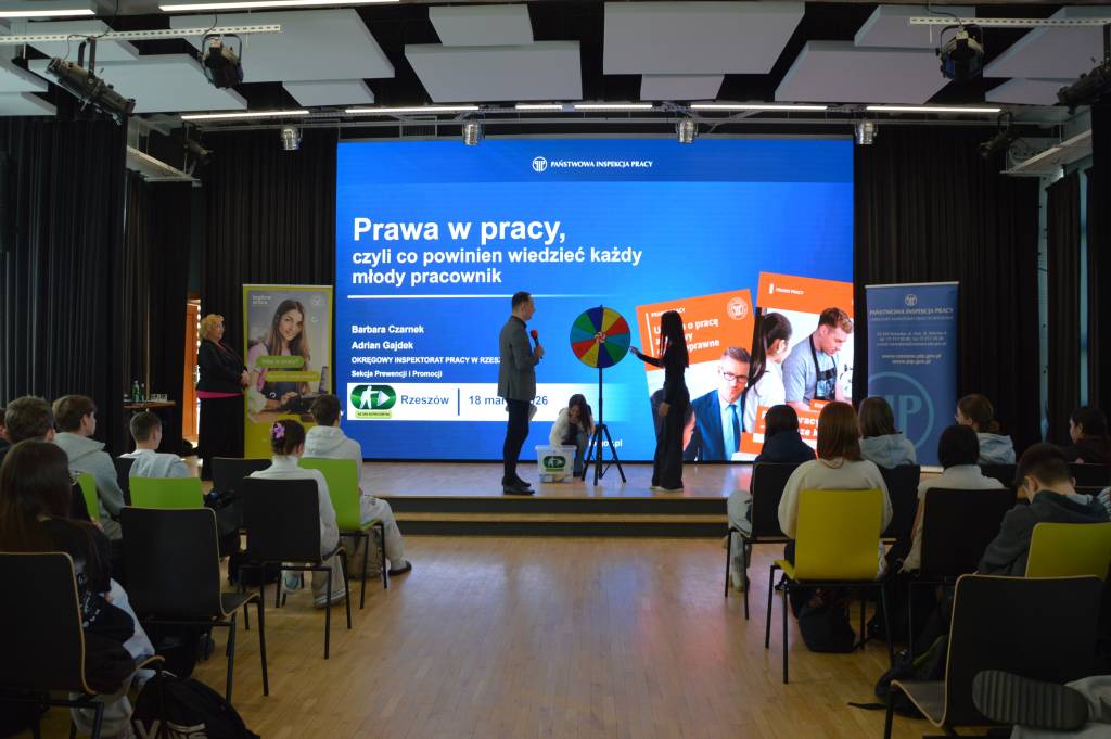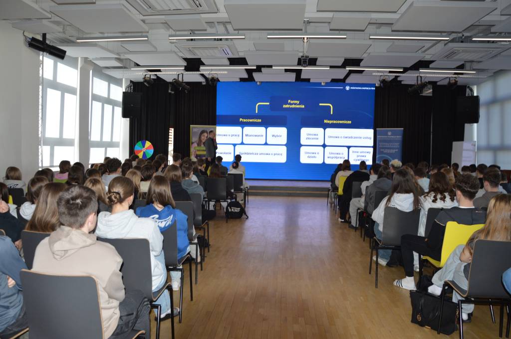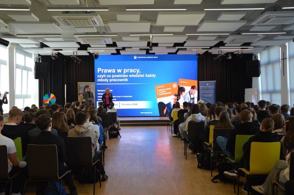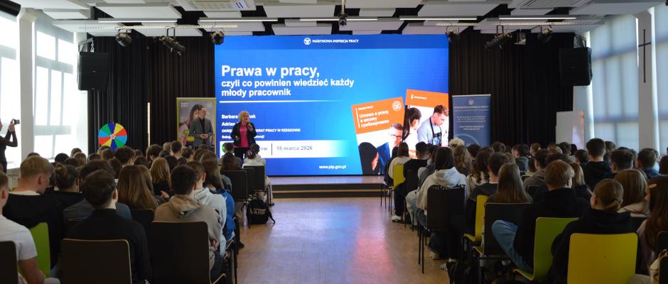 Spotkanie edukacyjne, w którym wzięło udział prawie 200 uczniów, wpisuje się również w realizowaną przez Państwową Inspekcję Pracy w 2026 r. kampanię promującą umowy o pracę w miejsce umów cywilnoprawnych pt.: „Bezpieczni na etacie”.