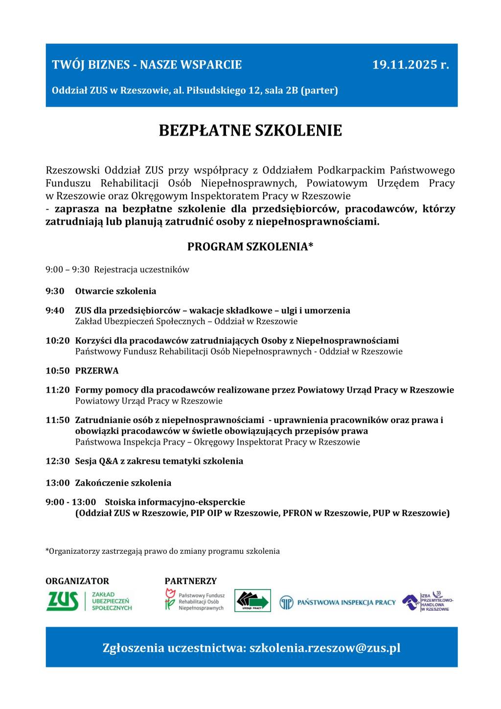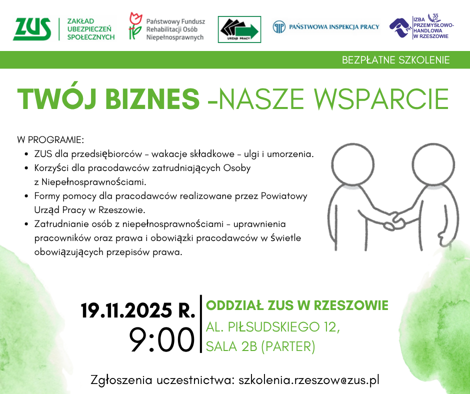 Zapraszamy na bezpłatne szkolenie pn. „TWÓJ BIZNES – NASZE WSPARCIE” dla przedsiębiorców zatrudniających osoby z niepełnosprawnościami.